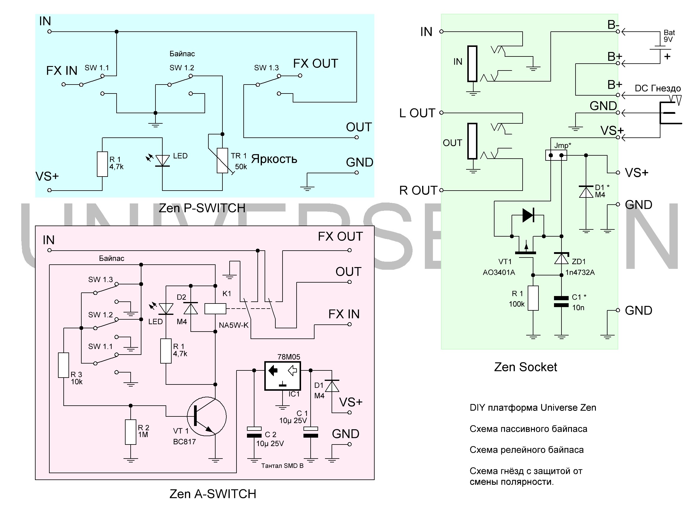 На первой схеме изображён стандартный байпас с индикацией на 3PDT кнопке с фиксацией (Zen P-SWITCH). В качестве бонуса, на эту плату установлен подстроечный резистор TR1 на 50 кОм для настройки яркости светодиода. Сжечь светодиод такой настройкой невозможно, потому что есть дополнительный резистор R1 который ограничивает ток светодиода. Подстроечный резистор можно исключить из схемы и заменить его перемычкой, замкнув крайние выводы отрезком провода. Если светодиод настолько «ослепительный» что хочется взять и … то в этом случае просто увеличивайте номинал резистора R1 на 4,7 кОм в 2-10 раз. На второй схеме изображен релейный байпас с управлением механической 3PDT кнопки с фиксацией (Zen A-SWITCH). Здесь резистор R1 также отвечает за ограничение тока светодиода и также влияет на его свечение как и в схеме выше. В остальном это понижающая схема на SMD компонентах, которая преобразует питание педали в 5 вольт, посредством микросхемы 78M05 (это SMD версия обычного пятивольтового стабилизатора). Танталовые конденсаторы C1 и C2 в SMD корпусе «SMD B» служат фильтрами. Диод D1 дополнительно защищает стабилизатор от смены полярности. Далее пониженный постоянный ток 5 вольт, через кнопку будет подаваться на транзистор VT1 BC817 и открывать его для включения реле. Фишка этой схемы в том, что транзистор будет открываться при достаточно широких значениях тока и напряжения на базе, что даёт нашей кнопке право на смерть одной или двух контактных групп, неидеальный контакт и прочее. Третья схема это защита от переполюсовки и некий хаб для гнёзд (Zen Socket). С гнёздами всё понятно сразу, а с защитой от переполюсовки поподробнее. Питание приходит на схему от гнезда с тремя контактами, которое вынесено за пределы платы. Дальнейший путь тока по плате приводит нас к развилке на две линии: перемычка JMP и вторая линия на транзистор. Если нам необходимо обеспечить базовую диодную защиту от смены полярности без лишнего усложнения схемы, то мы повернём на этой развилке в сторону JMP. Это значит, что перемычку JMP надо замкнуть, а защитный диод D1 впаять. Остальные детали впаивать не нужно. К плюсам данной схемы можно отнести простоту и тот факт что она, сама по себе никак пагубно не влияет на работу остальной педали. Из минусов стоит отметить тот факт, что блок питания, чья сила тока и напряжение будут превышать допустимую силу тока и напряжение диода, просто уничтожит и диод и схему после него. А если диод окажется мощнее блока питания, то при неправильном подключении он будет замыкать на себе выход с блока питания практически накоротко. Выводы: диодная защита хороша в качестве кратковременной защиты для осознанного пользователя и подходит для тех, кто «всё знал, но однажды случайно впарился». Второй путь заключается в защите на мосфет-транзисторе. В этом случае перемычку JMP устанавливать не надо, контакты остаются в разомкнутом состоянии и нет никакой необходимости впаивать диод D1. На плату нужно смонтировать транзистор VT1, резистор R1, стабилитрон ZD1 и опционально конденсатор C1. Адаптеры для потенциометров. Радиолюбители делятся на две группы; для кого приемлемо подключать все органы управления на проводах, а затем с остервенением запихивать всю эту «лапшу» внутрь корпуса. Подход имеет право на жизнь, ведь именно так производились многие педали компании BOSS. Безусловно, большим подарком для электр