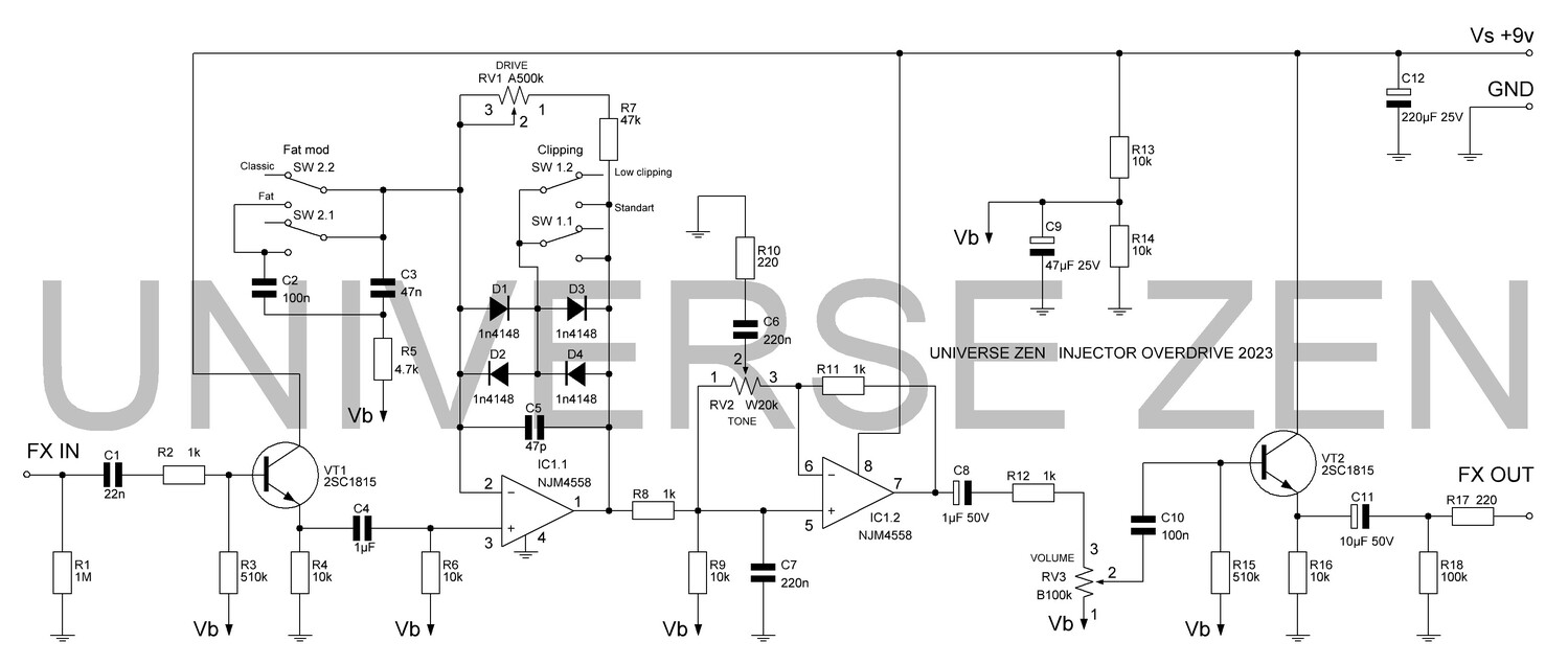 Всем привет! Сегодня выходит видеоролик про Инжектор овердрайв. Педаль создана по мотивам Tube screamer и педалей Maxon OD808. Практически всю инфу по сборке можно найти по ссылкам в описании к видео на ютубе. Проект реализован в рамках универсальной платформы. Подробнее тут. Вы можете воспользоваться моим проектом, заказать платы самостоятельно или замодить педаль под себя. Удачных сборок! Lay6 это файл проекта печатных плат. Листаем его по вкладкам снизу. Чем открывать, есть в статье про DIY платформу на новом сайте мастерской. И два архива это: INJECT это плата эффекта, а FRONT INJECT это плата-шильдик. Схема платы эффекта. Сама плата Перечень элементов. Нумерация соответствует и схеме и печатной плате. D1 = 1n4148 IC1 = NJM4558 можно поэкспериментировать с заменой операционного усилителя на TL072 или NE5532 и другие. Все резисторы 0805 или 1206 SMD SW 1 = DPDT Toggle switch on-on RV1 = A500k VT1 = 2SC1815 Покупка компонентов. Все ссылки для примера. Ассортимент перекликается, компонуйте заказы как угодно. Резисторы популярных номиналов можно взять с запасом на будущие проекты. Транзисторы 2SC1815 в корпусе TO92 либо аналоги в SMD — 2 шт. Микросхема JRC4558 в корпусе DIP8 — 1 шт. Панелька под микросхему DIP8 опционально — 1 шт. Тумблеры DPDT на два положения ON-ON — 2 шт. Диоды 1n4148 — 4 шт. Конденсатор SMD в корпусе 0805 или 1206 на 47 пФ 50 вольт — 1 шт. Конденсаторы электролитические, выводные: Конденсаторы плёночные, выводные, от 50 вольт или выше: Резисторы SMD с типом корпуса 0805 или 1206: Потенциометры: | |
