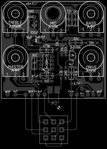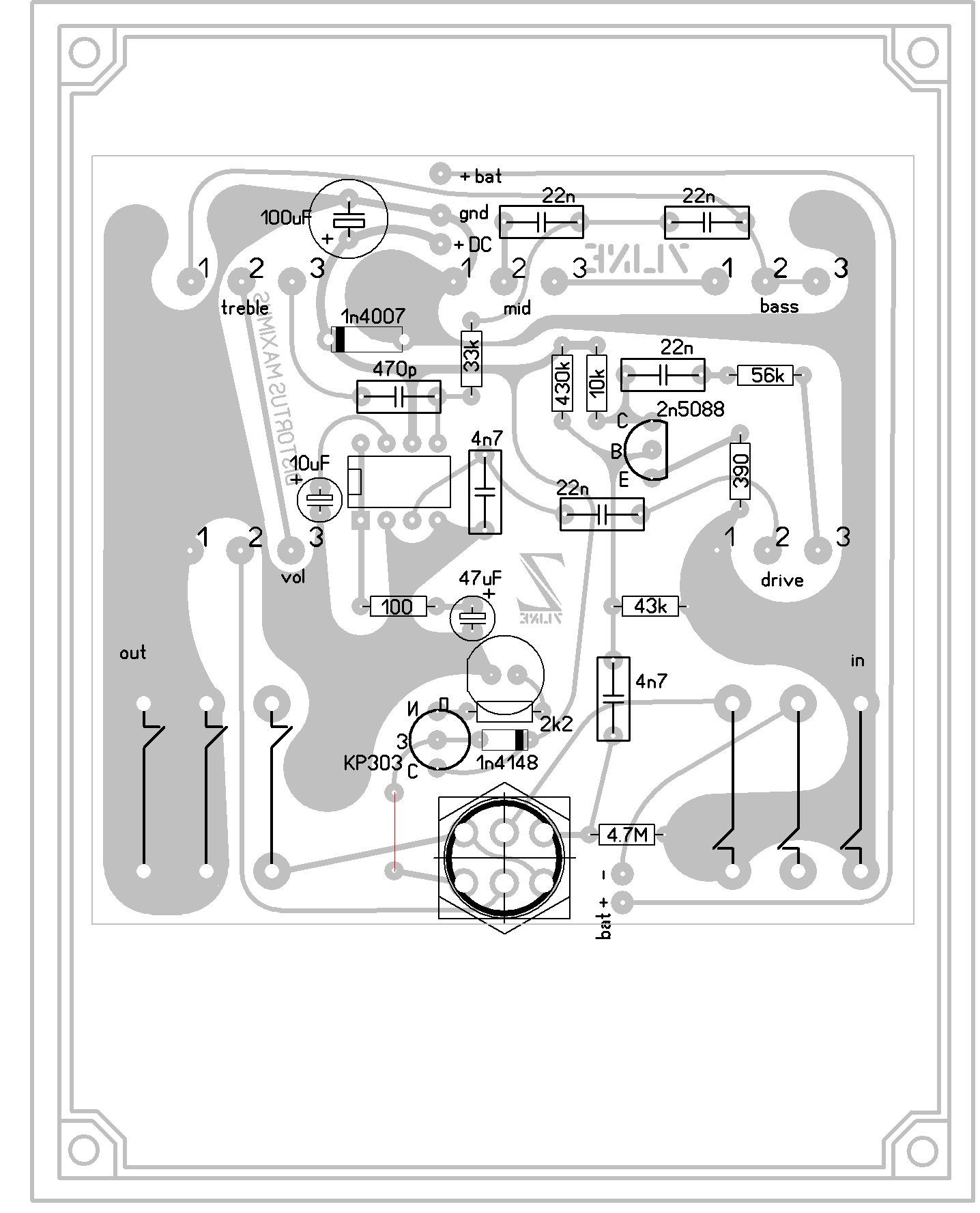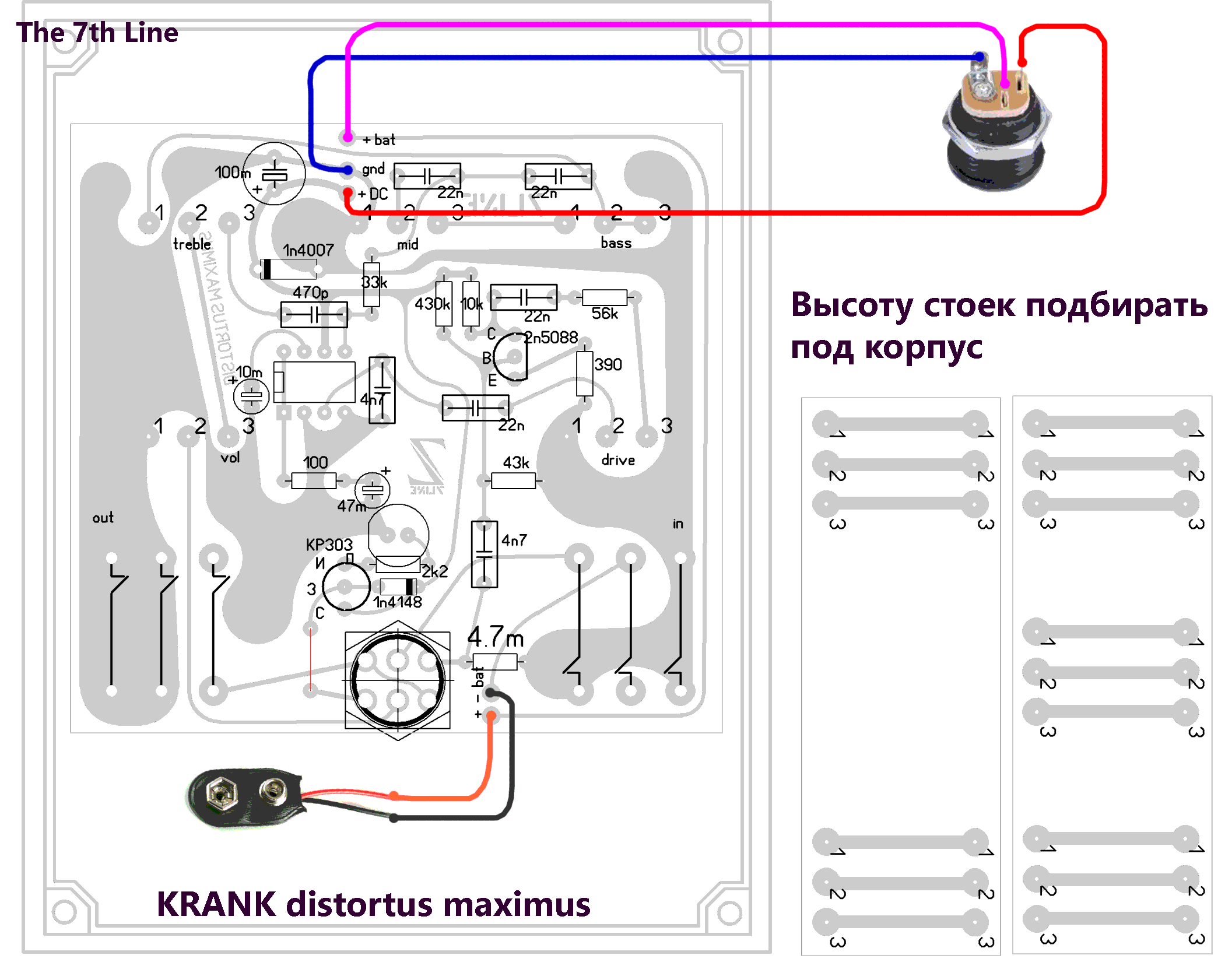 Делаем педаль KRANK distortus maximus. Простая схема, которая вполне сгодится для начинающих радиолюбителей. В видео есть сравнение разных микросхем LM386. Печатная плата по ссылке, а картинки открываем с правой кнопки для полного разрешения. Внутри Lay файла тыкайте по вкладкам, там две печатки в одном файле. Схема педали выглядит так. Вид платы со стороны деталей. Вид платы со стороны дорожек. Альтернативный вариант печатной платы под 3PDT кнопку. Вид со стороны дорожек. Детали впаиваются с обратной стороны, а потенциометры прикручиваются прям к плате. Ручки потенциометров получаются со стороны дорожек. Рисунок подключения гнезда питания и батарейки для основной платы. Это единственное, что подключается на проводах. Список деталей. Вариант педали с ПатреонаТысячу лет назад собирал Кранк. Спустя какое то время я сделал ещё один кранк, но добавил небольшую тонкомпенсацию на ручку гейна, добавил выходной буфер и собрал всё это добро в маленьком 124 корпусе. Фото внутренностей не сохранил, но монтаж типичный для моих проектов, джеки припаиваются с обратной стороны платы вверх ногами (выводами). Печатку надо зеркалить. Печатку и фотошоповские файлы шильда можно скачать по ссылке. | |