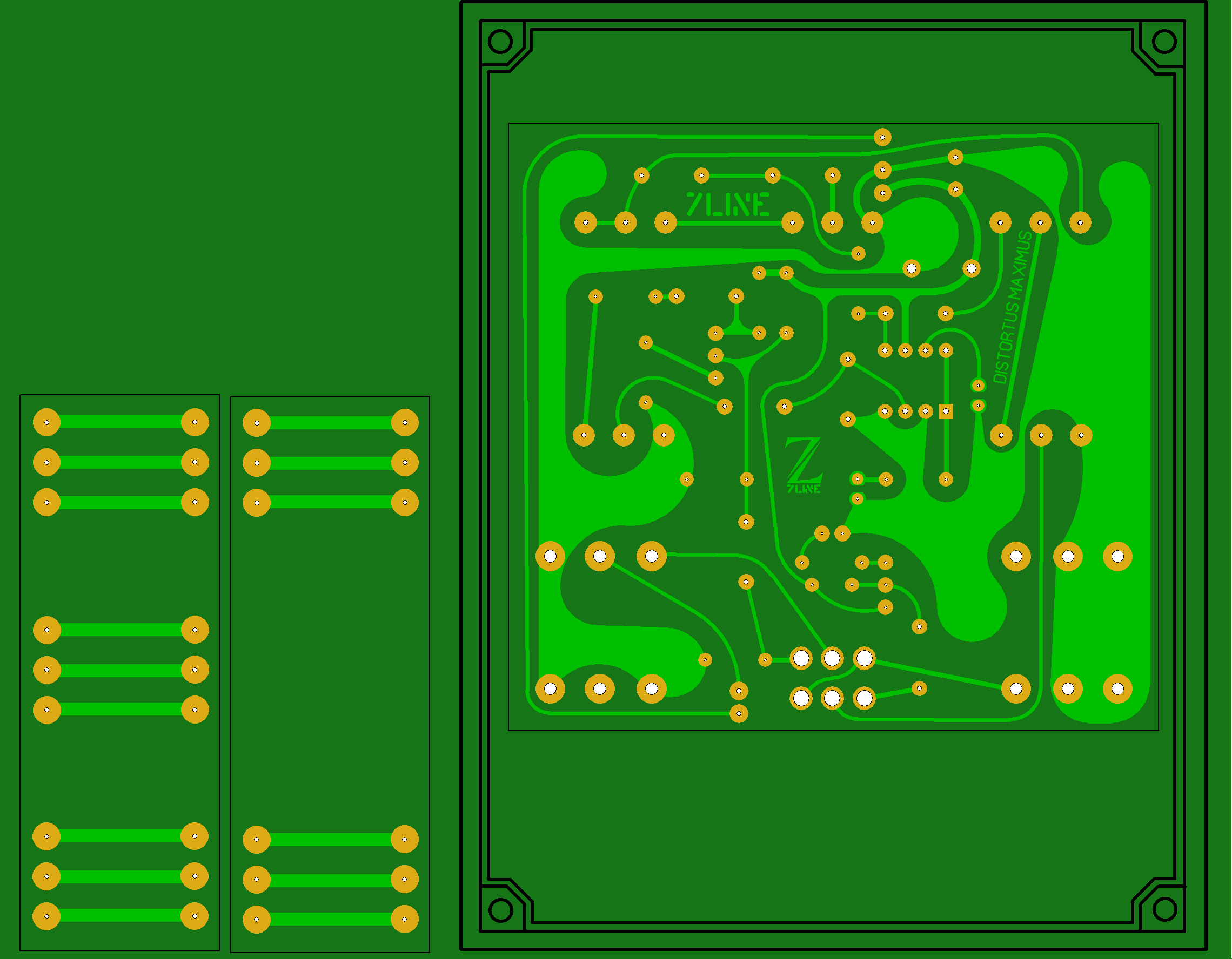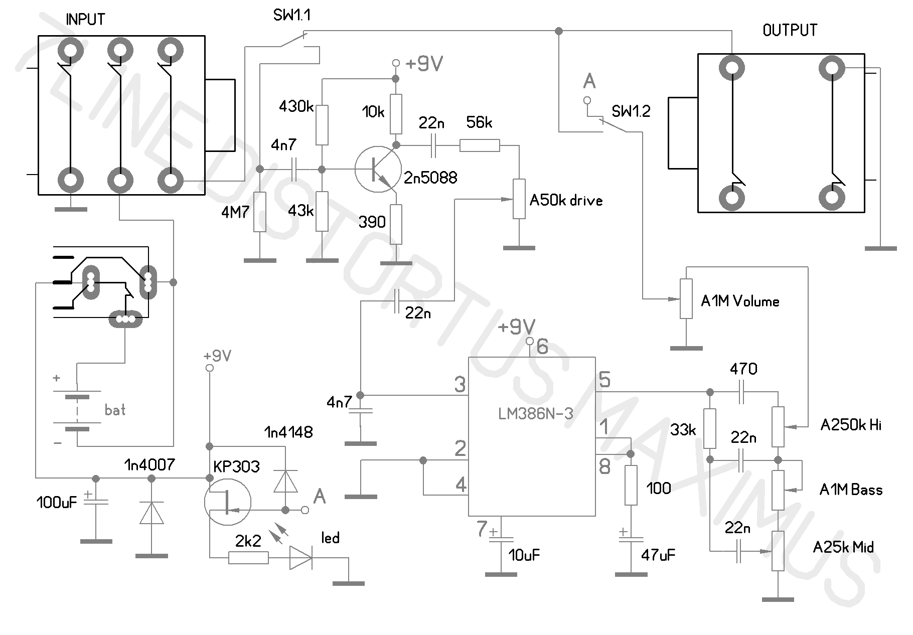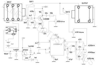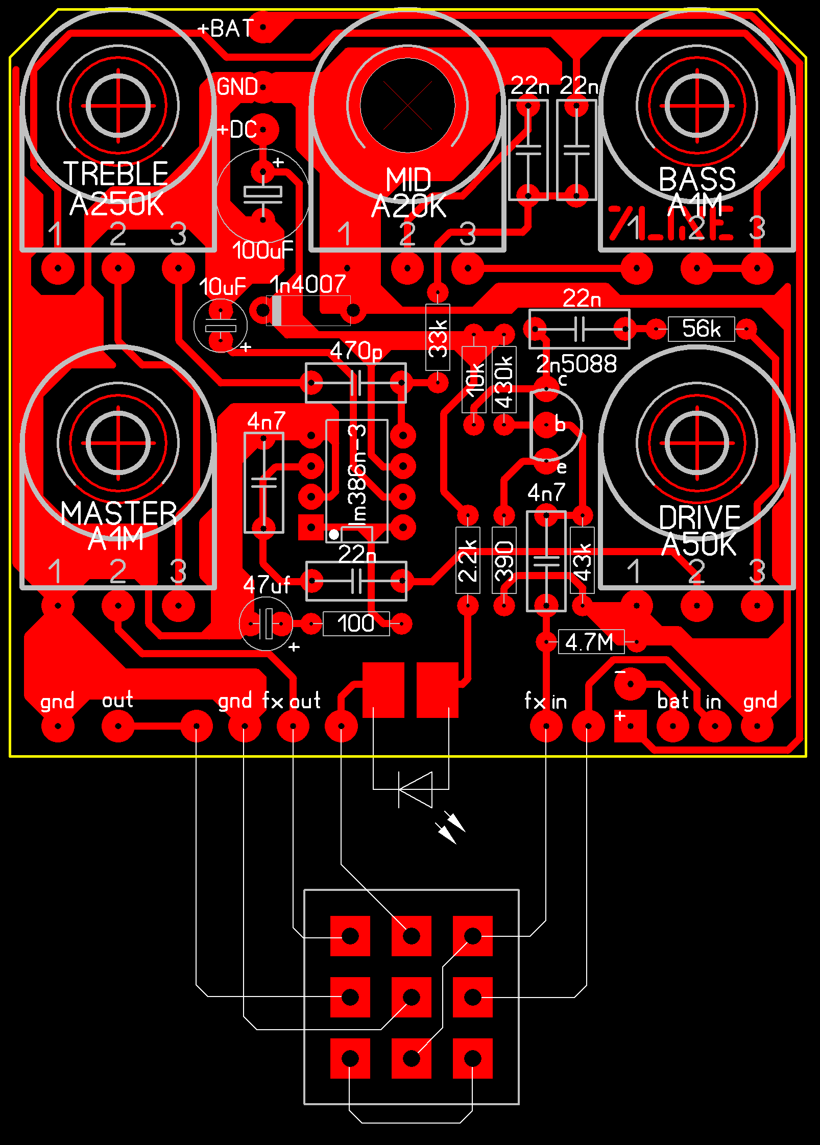 Делаем педаль KRANK distortus maximus. Простая схема, которая вполне сгодится для начинающих радиолюбителей. В видео есть сравнение разных микросхем LM386. Печатная плата по ссылке, а картинки открываем с правой кнопки для полного разрешения. Внутри Lay файла тыкайте по вкладкам, там две печатки в одном файле. Схема педали выглядит так. Вид платы со стороны деталей. Вид платы со стороны дорожек. Альтернативный вариант печатной платы под 3PDT кнопку. Вид со стороны дорожек. Детали впаиваются с обратной стороны, а потенциометры прикручиваются прям к плате. Ручки потенциометров получаются со стороны дорожек. Рисунок подключения гнезда питания и батарейки для основной платы. Это единственное, что подключается на проводах. Список деталей. Вариант педали с ПатреонаТысячу лет назад собирал Кранк. Спустя какое то время я сделал ещё один кранк, но добавил небольшую тонкомпенсацию на ручку гейна, добавил выходной буфер и собрал всё это добро в маленьком 124 корпусе. Фото внутренностей не сохранил, но монтаж типичный для моих проектов, джеки припаиваются с обратной стороны платы вверх ногами (выводами). Печатку надо зеркалить. Печатку и фотошоповские файлы шильда можно скачать по ссылке. | |