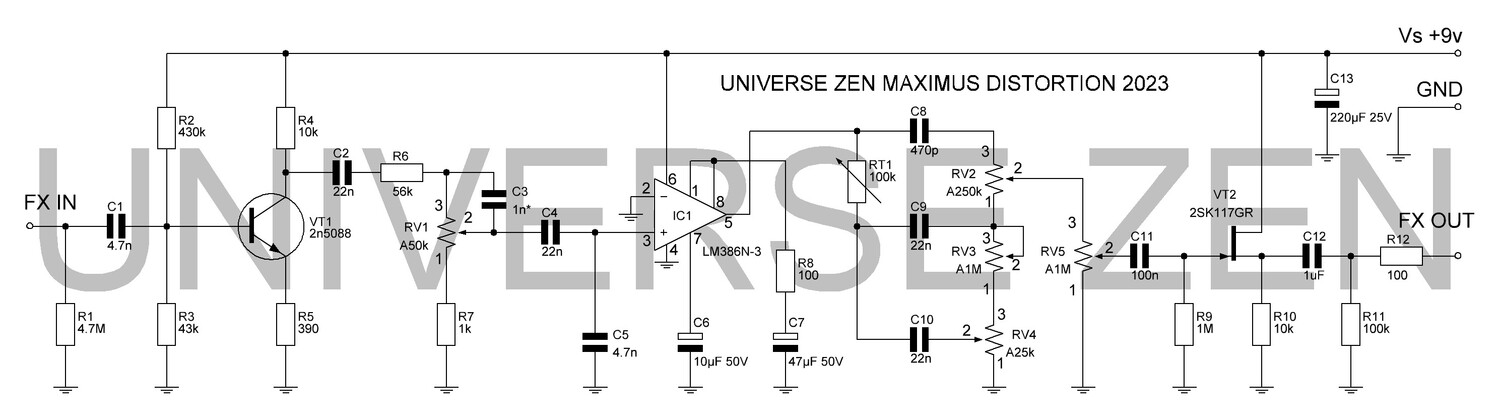Всем привет! Выкладываю материалы по педали MAXIMUS DISTORTION. Эта педаль выполнена по мотивам KRANK Distortus Maximus с добавлением буфера на выходе эффекта, который собран на основе полевого транзистора и также добавлена возможность тонкомпенсации на ручке Gain. Как это всё будет работать посмотрим в видео. MAXIMUS.zip это Gerber платы эффекта MAXIMUS FRONT.zip это Gerber шильдика MAXIMUS.lay6 этой файл проекта Схема педали. Плата педали. Перечень элементов. Нумерация соответствует и схеме и печатной плате. C1 = 4.7n IC1 = LM386N-3 Все резисторы SMD 0805 или 1206 RT1 = 100k многооборотный подстроечный резистор RV1 = A50k VT1 = 2n5088 в SMD или DIP корпусе, либо аналогичный. Закупка компонентов. Как обычно, ссылки для примера. Плёночные конденсаторы: Электролитические конденсаторы на напряжение не ниже 16-25 вольт (больше можно): СМД конденсаторы: Транзисторы: Микросхема: LM386N-3 — 1 шт. (панелька DIP8 под микросхему по желанию) Постоянные резисторы СМД 0805, 1206: Потенциометры: | |
