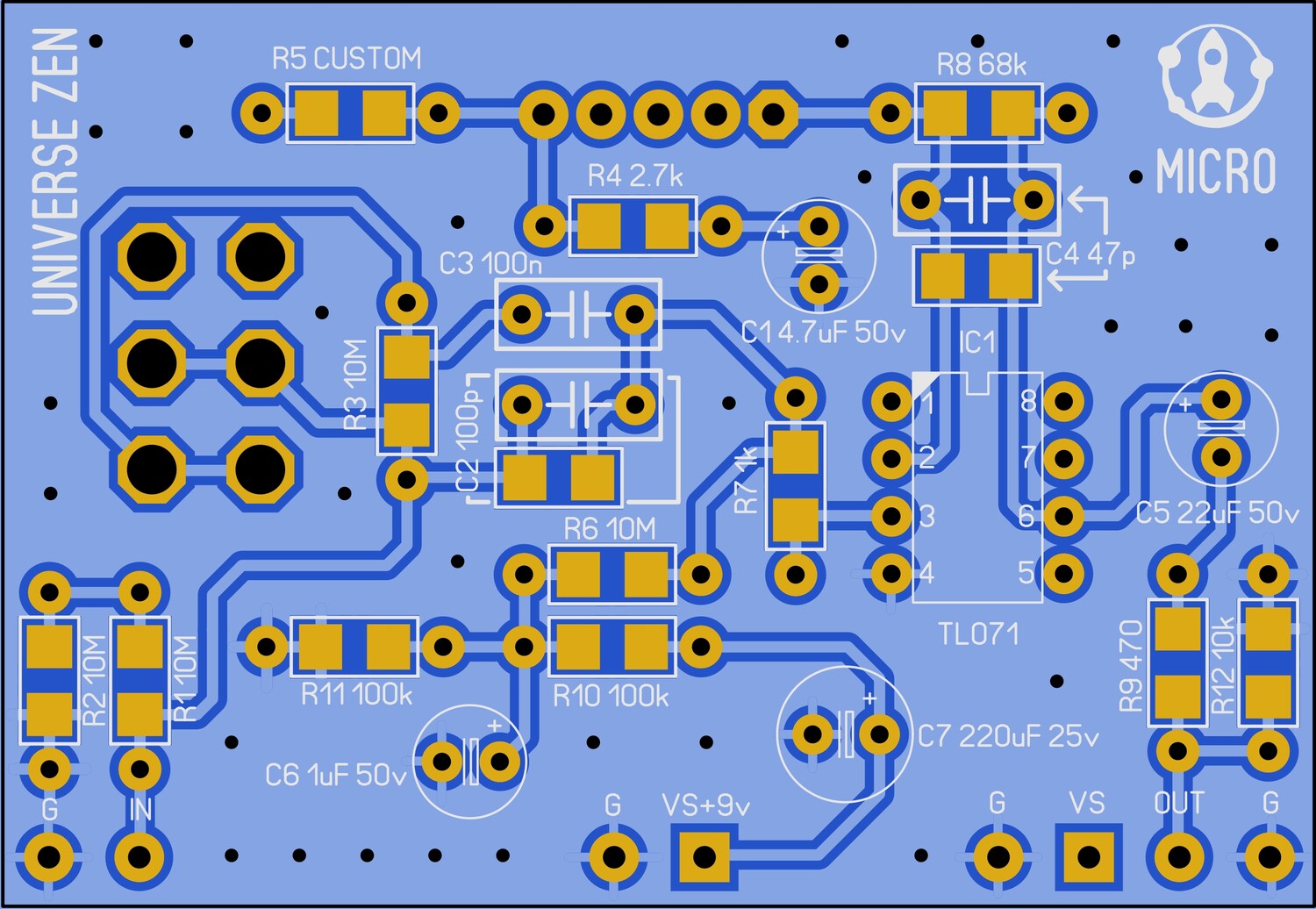 MICRO BOOSTERВсем привет! Выкладываю материалы по Микро бустеру. До самого конца думал что выпуск будет проходным, пока не затестил педаль после дисторшена и перед ламповым предусилителем. Бустер выступил в роли согласующего звена и получился звук гибридного транзисторно-лампового предусилителя. Вы можете скачать герберы и печатную плату. Микро фронт это гербер шильдика. Микро ПЦБ это гербер платы эффекта. Схема эффекта Плата эффекта Перечень элементов. Нумерация соответствует и схеме и печатной плате. C1 = 4.7µF 50V IC1 = TL071 Все резисторы SMD 0805 или 1206 либо выводные мощностью 0,25 Вт или 0,125 Вт. SW 1 = DPDT Toggle switch on-on RV1 = C500k Покупка компонентов. Все ссылки для примера. Ассортимент перекликается, компонуйте заказы как угодно. Резисторы популярных номиналов можно взять с запасом на будущие проекты. Потенциометр C500k — 1 шт. Тумблер DPDT on-on — 1 шт. Панелька DIP8 — 1 шт. Микросхема TL071 — 1 шт. Постоянные резисторы в любом виде от SMD 0805 — 1206 до выводных мощностью 0,125-0,25 Вт. Конденсаторы на пикофарады могут быть SMD 0805 или 1206 либо выводными, нанофарады плёночный выводной. Напряжение от 25-50 вольт и выше. Конденсаторы электролитические. Напряжение от 25 вольт и выше. | |