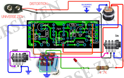 MXR distortion + Довелось собрать MXR distortion +. Мне эта педаль понравилась в сочетании с педалью блендера и бас гитарой. Так выглядит схема устройства, а распайка на плате ниже. Внутри корпуса все компоненты должны располагаться следующим образом. Дополнительный здоровый переключатель с диодами и проводами на плату, это обычное переключение между кремниевым ограничением и германиевым. С германиевым конечно же будет звучать потише. | |